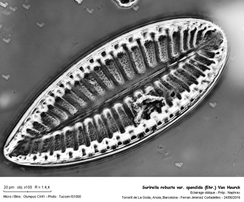 Diatomea planctònica, epilítica en aquest cas, amb unes dimensions de 100 x 42 µm, costelles transversals en nombre de 21 en 100 µm.