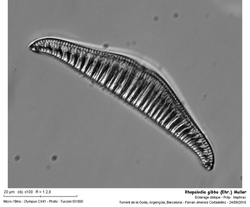 Diatomea de la família de les Epithemiacees, amb dimensions de 60 x 10 µm, 7 costelles transversals en 10 µm, puntuacions en doble fila entre les costelles i de difícil visualització. El rafe està situat just a la vora dorsal de la valva.