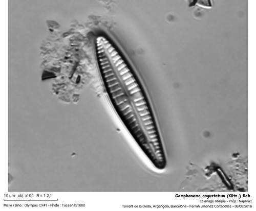 Diatomea Naviculàcea, epífita, amb dimensions de 28 x 6 µm, 10 estries en 10µm, a la zona central i 14 estries a les extremitats. Les puntuacions de les estries no són visibles en M.O.