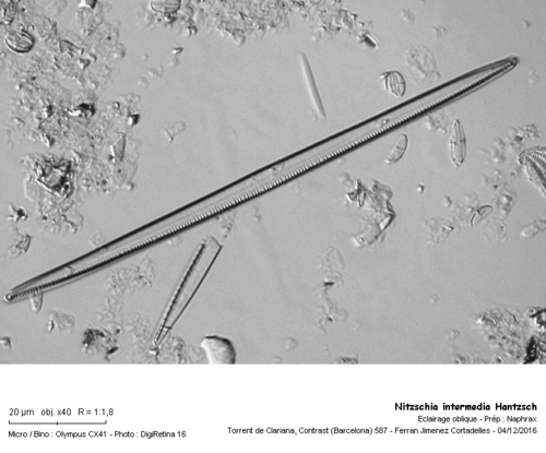 Nitzschia de la secció Lanceolatae, de mida gran (150 x 6 µm) de forma llargament lanceolada i extrems capitats, fibules ben marcades (12 en 10 µm) i estries fines en nombre de 25 en 10 µm.