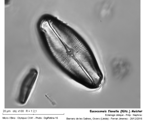 Area axial estreta a la hipovalva, rafe oblic amb els extrems distals fortament inclinats en sentits oposats. L’area central es reduïda, de forma arrodonida. Les estries són radiants, en nombre de 22 en 10 m, al centre (foto 1).