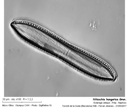 Diatomea amb el frústul linear, lleugera constricció al centre i extrems acuminats. Presenta ondulacions longitudinals amb interrupció de les estries.